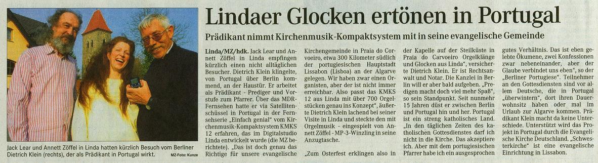 Linda/MZ/hdk. Jack Lear und Annett Zöffel in Linda empfingen kürzlich einen nicht alltäglichen Besucher. Dietrich Klein klingelte, von Portugal über Berlin kommend, an der Haustür. Er arbeitet als Prädikant - Prediger und Vorstufe zum Pfarrer. Über das MDR-Fernsehen hatte er via Satellitenschüssel in Portugal in der Fernsehserie "Einfach genial" vom Kirchenmusik-Kompaktsystem "KMKS 12" erfahren, das im Digitalstudio Linda entwickelt wurde (die MZ berichtete mehrfach).