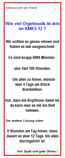 Weitere Lieder sowie Orgelmusik zum Eingang und Ausgang im Gottesdienst können Sie auf dieser Seite unserer Homepage anhören: Musikbeispiele aus dem KMKS 12