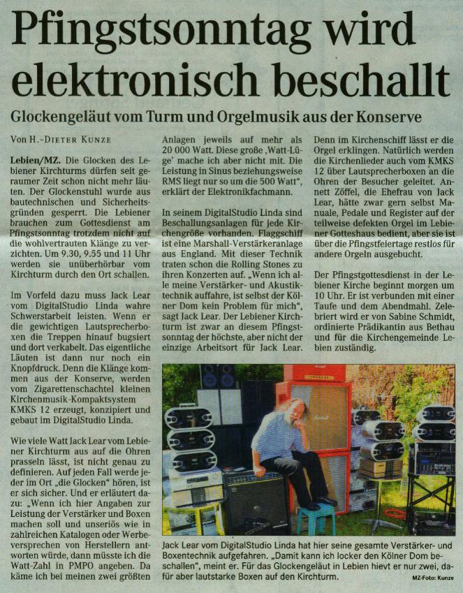 In seinem DigitalStudio Linda sind Beschallungsanlagen für jede Kirchengröße vorhanden. Flaggschiff ist eine Marshall-Verstärkeranlage aus England. Mit dieser Technik traten schon die Rolling Stones zu ihren Konzerten auf. "Wenn ich alle meine Verstärker- und Akustiktechnik auffahre, ist selbst der Kölner Dom kein Problem für mich", sagt Jack Lear. Der Lebiener Kirchturm ist zwar an diesem Pfingstsonntag der höchste, aber nicht der einzige Arbeitsort für Jack Lear. Denn im Kirchenschiff lässt er die Orgel erklingen. Natürlich werden die Kirchenlieder auch vom KMKS 12 über Lautsprecherboxen an die Ohren der Besucher geleitet. Annett Zöffel, die Ehefrau von Jack Lear, hätte zwar gern selbst Manuale, Pedale und Register auf der teilweise defekten Orgel im Lebiener Gotteshaus bedient, aber sie ist über die Pfingstfeiertage restlos für andere Orgeln ausgebucht.
